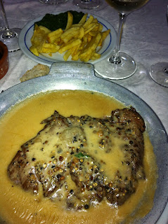 No final do ano voltei a fazer uma incursão a um restaurante que frequento de vez em quando, A Travessa do Rio, em Benfica, para mais uma excelente refeição em grupo. Após várias indecisões nos pedidos, estes acabaram por recair em apenas dois pratos: um arroz de lagosta e um bife do lombo com pimenta acompanhado de batatas fritas e esparregado, apenas para mim e para o Pirata. E como o bife causou impacto! Os restantes comensais ficaram de olhos (e papilas também) arregalados com a suculência deste bife, que estava simplesmente divinal! Quem comeu o arroz de lagosta ficou com pena de não ter escolhido o bife...