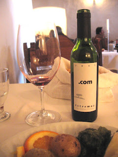 Quanto aos líquidos, tendo eu provado na anterior visita um vinho de Tiago Cabaço, filho da proprietária do restaurante, de nome .Com, deparámos agora com um outro na prateleira chamado .Beb 2007, um patamar acima. Não deslustrou. É um vinho jovem, com um aroma predominantemente frutado, corpo médio e um final algo discreto. Tem uma designação original, aliás como os irmãos .Com e Blog, o último dos quais parece ser o topo de gama da marca. Rótulo e contra-rótulo apresentam um design clean. Tudo ali anda, pois, de mão dada, o carácter do vinho e a roupa exterior da garrafa. Um vinho que, não sendo brilhante, é honesto e não defrauda. Terminada a primeira garrafa, a dificuldade de escolha da segunda. Encontrámos na carta uma das nossas paixões, um Sogrape Reserva, escolha desde logo secundada por outro dos convivas, mas infelizmente o escanção não encontrou as garrafas, pelo que acabámos por experimentar, por sugestão do mesmo, um Herdade do Paço do Conde Reserva 2005. Um vinho produzido próximo de Beja, na zona de Baleizão (a terra onde Catarina Eufémia foi morta por um tenente da GNR em 1954). Este mostrou-se mais complexo do que o anterior, com aromas mais profundos, um outro corpo e outra persistência na boca.